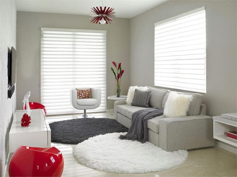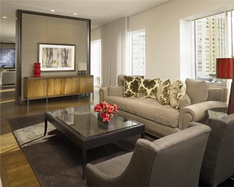 Căn phòng khách này sử dụng chủ yếu các màu trung tính. Chúng ta có thể thấy từ sơn tường đếm thảm trải sàn và gối ném, tất cả đều mang game màu xám. Tuy nhiên, điểm nhất của căn phòng đến từ sự sắp xếp hợp lý của những chiếc ghế màu đỏ tươi, chụp đèn và hoa đã phá vỡ vẻ đẹp “lạnh lùng” của không gian.